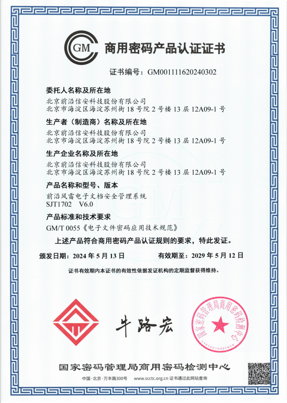 近日,乐鱼手机站入口自研产品成功取得《商用密码产品认证证书》,产品符合GM/T0065-2019《商用密码产品生产和保障能力建设规范》、GM/T0066-2019《商用密码产品生产和保障能力建设实施指南》,顺利通过国家密码管理局安全性审查,取得由国家密码管理局商用密码检测中心颁发的《商用密码产品认证证书》,再次彰显了我公司在信息安全领域的创新实力和技术水平。