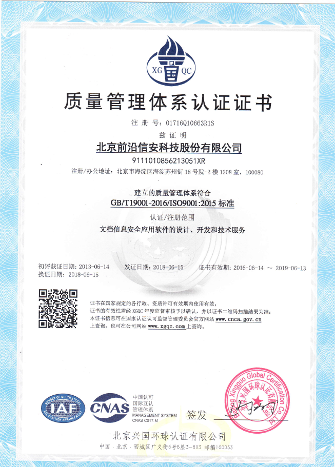 信息安全管理体系认证证书(GB/T 22080-2016/IS0/IEC 27001 : 2013)