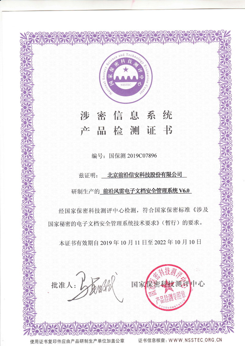 国家保密科技测评中心“涉密信息系统产品检测证书“