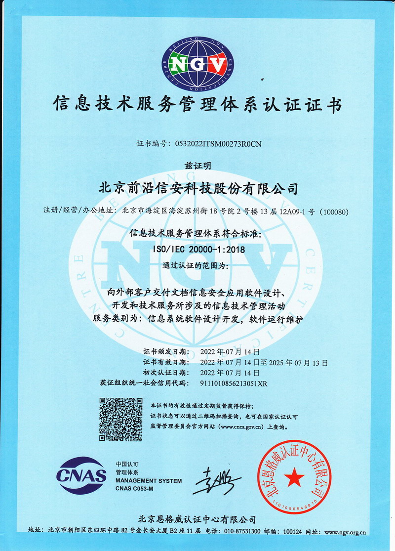 信息技术服务管理体系认证证书(ISO/IEC 20000-1 : 2008)