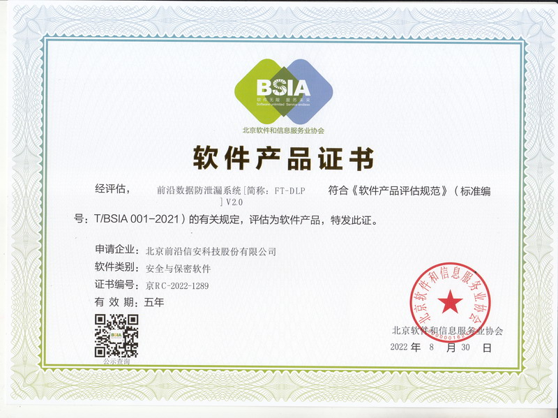 北京软件和信息服务业协会”软件产品证书 “--前沿数据防泄漏系统